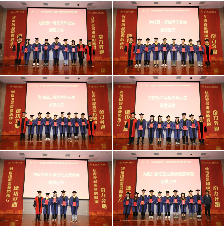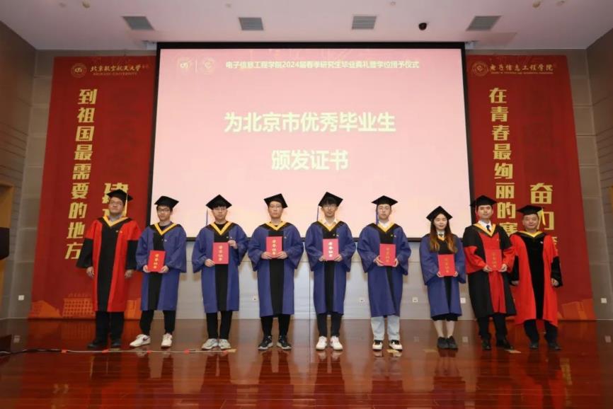 毕业典礼在庄严的国歌声中正式开始。学院学位分委会主席、院长曹先彬教授宣读了电子信息工程学院2024届春季研究生毕业生学位授予决定。学院党委书记徐亚军老师宣读了2024年春季“北京市优秀毕业生”和“校级优秀毕业生”名单。副院长戴飞教授宣读了2024年春季“校级优秀硕士学位论文获奖者及指导教师”名单。副院长蔡开泉教授宣读了2024年春季“振兴国防就业奖学金”获奖名单。党委副书记姜宇老师宣读了2021级硕士研究生“校友班级联络员”名单。