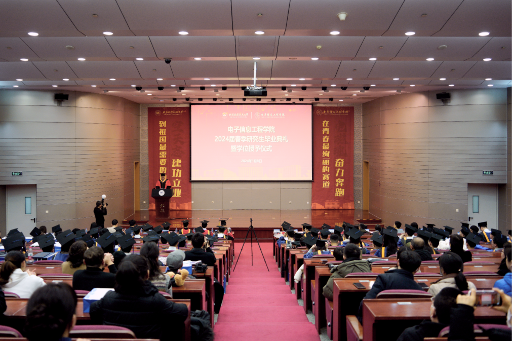 1月8日,北京亚洲成人在线一二三四五六区电子信息工程学院2024届春季研究生毕业典礼暨学位授予仪式在学院路校区新主楼第一报告厅举行。共有12名博士毕业生、119名硕士毕业生圆满完成学业,在典礼现场与老师、家人、亲友共同见证人生重要时刻。学院党委书记徐亚军,院长曹先彬,副院长戴飞、蔡开泉、徐迈,党委副书记姜宇,系主任代表秦红磊、吴晓君、吴琦、郑铮等出席典礼。典礼由学院研究生教学副院长陈杰主持。