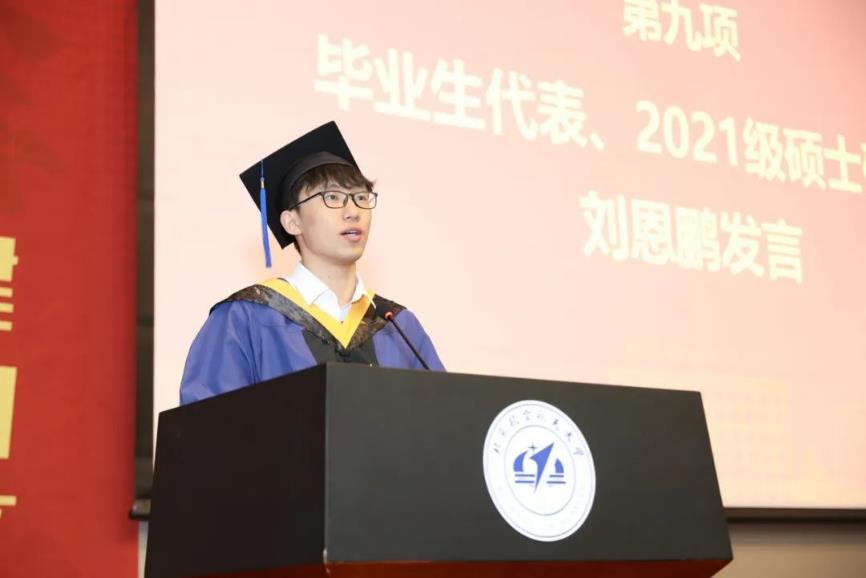 毕业生代表、2021级硕士研究生刘恩鹏同学回顾了两年半的研究生生活。他感谢学校和学院培养了自己开拓创新、解决问题的能力,号召同学们与光同行,谨记身为北航人、电子人的使命与担当,为国家现代化建设和民族伟大复兴贡献自己的青春力量。