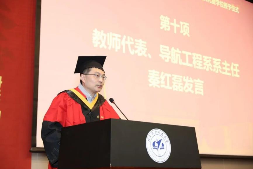 教师代表、导航工程系系主任秦红磊教授代表学院全体教师祝贺同学们顺利毕业。他结合自身求学经历,回顾了和同学们相处的点点滴滴,对同学们在科研工作中所作出的贡献表示感谢,希望同学们在未来的生活和工作中,不忘师生情谊、永远健康快乐,不断取得新的成就。